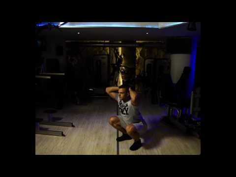 1) Utrzymując prawidłową pozycję wyjściową i naturalną krzywiznę kręgosłupa, wykonaj płynny i powolny przysiad do pozycji poniżej kąta prostego, wraz z powolnym wdechem powietrza.