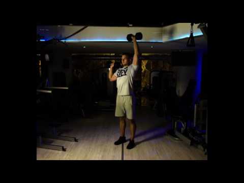1) Utrzymując prawidłową pozycję wyjściową, weź wdech, następnie unosząc ramię oraz prostując łokieć, wykonaj wyciskanie hantli nad głowę.
