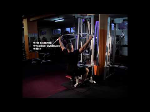 1) Weź wdech. Odchyl się nieznacznie do tyłu i wypinając klatkę piersiową, zainicjuj ruch poprzez ściągnięcie łopatek w dół i do siebie, przyciągnij drążek w stronę górnej części klatki piersiowej, opuszczając łokcie wzdłuż tułowia w kierunki bioder.