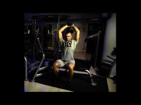 1) Weź wdech, utrzymując prawidłową pozycję wyjściową, ramiona utrzymuj nieruchomo, łokcie blisko głowy, powoli obniżaj sztangielkę za głowę do momentu wyczucia silnego rozciągnięcia tricepsa.