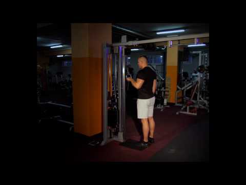 1) Weź wdech, utrzymując prawidłową pozycję wyjściową; ramię utrzymuj nieruchomo, łokieć blisko tułowia, prostuj ramię, ściągając uchwyt wyciągu w dół i mocno napinając triceps.